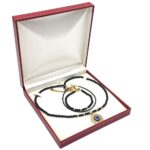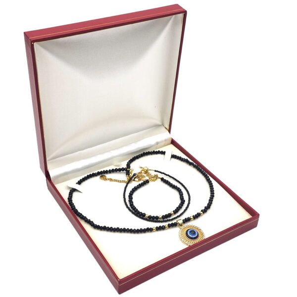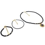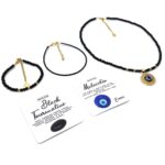 Discover the power and elegance of the Evara Malocchio Black Tourmaline Evil Eye Set, featuring a necklace, bracelet, and anklet designed for both protection and style. This set combines the protective properties of Black Tourmaline with the symbolic power of the Evil Eye, creating a versatile accessory trio.